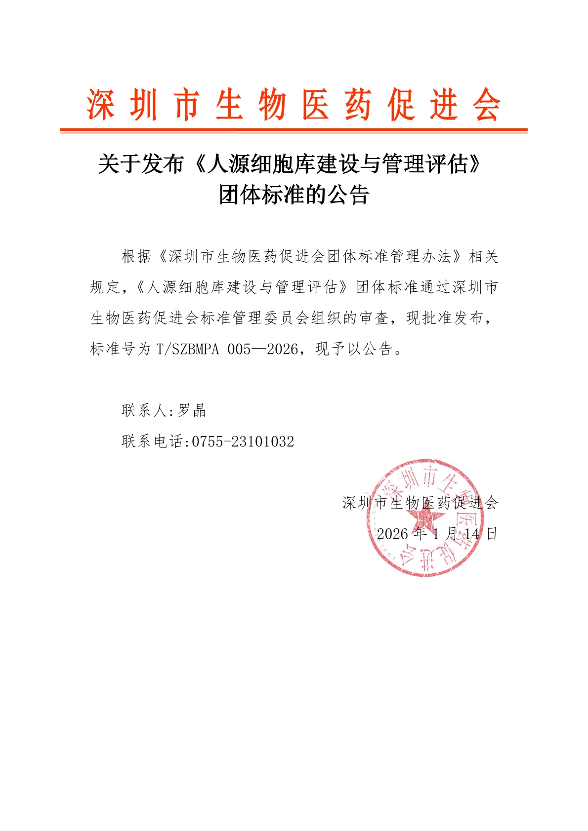 根据《深圳市生物医药促进会团体标准管理办法》相关规定,《人源细胞库建设与管理评估》团体标准通过深圳市生物医药促进会标准管理委员会组织的审查,现批准发布,标准号为T/SZBMPA 005—2026,现予以公告。