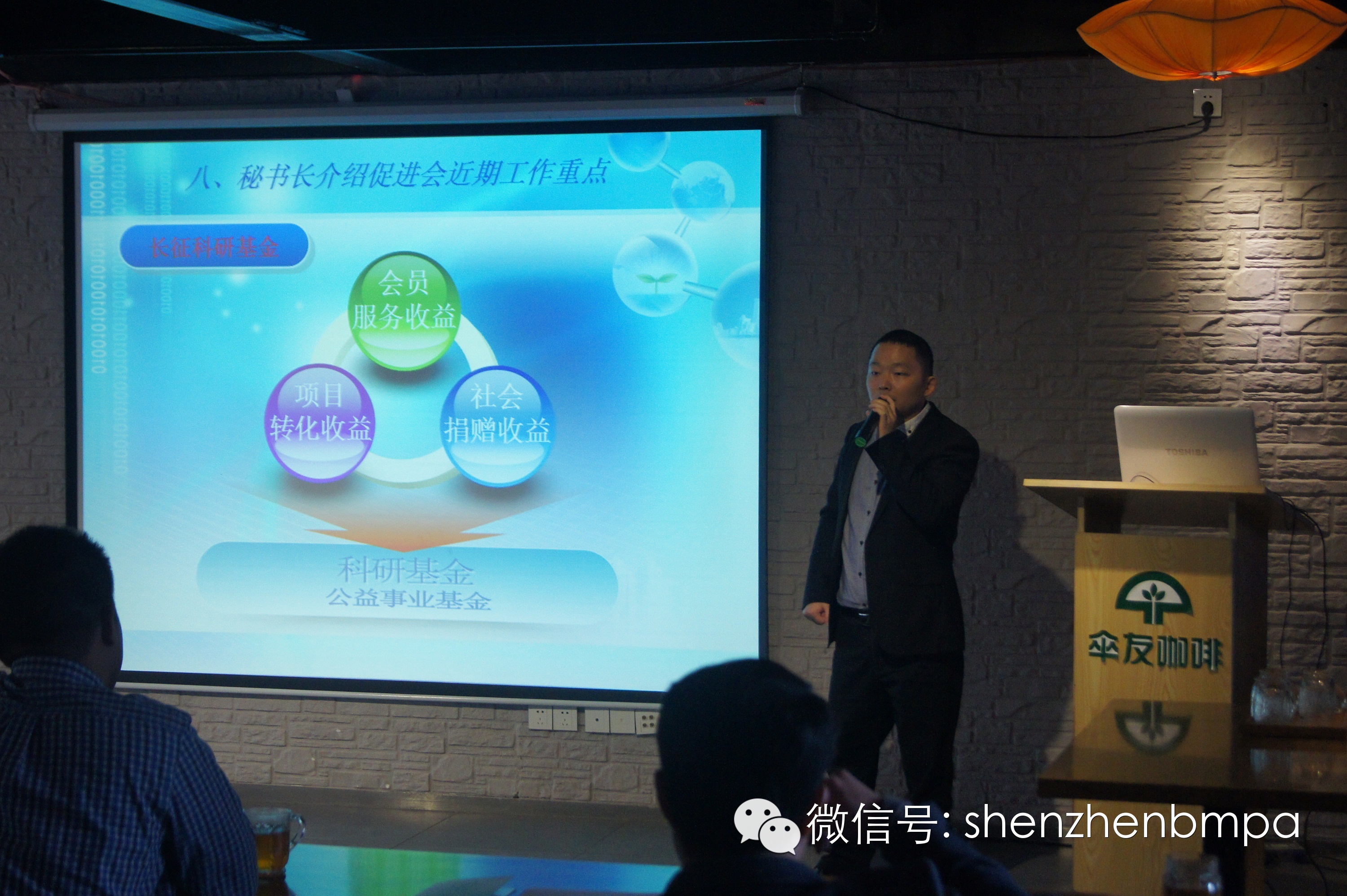 12月21日下午两点三十分,会议准时开始。首先促进会筹备小组就前期的筹备工作进行了简要的汇报。汇报内容主要包括前期的调研走访、发起人构思促进会理念、递交筹备资料和最终取得民政局“关于准予筹备成立深圳市生物医药促进会的批复”。