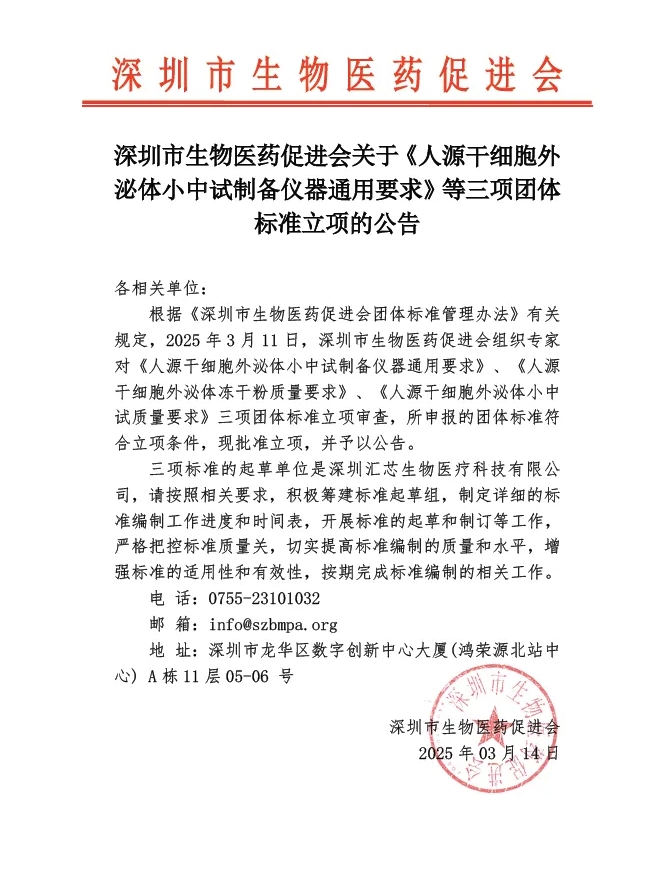 深圳市作为全国生物医药产业创新高地,率先出台《深圳经济特区细胞和基因产业促进条例》,并将生物医药纳入“20+8”产业集群重点布局。此次团体标准的制定,旨在填补人源干细胞外泌体小中试制备仪器通用要求、人源干细胞外泌体冻干粉质量要求、人源干细胞外泌体小中试质量要求等方面的标准空白,为行业提供技术规范,助力监管部门科学管理,推动外泌体产业标准化、高质量发展。