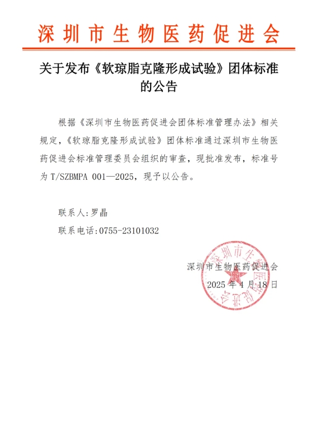 根据《深圳市生物医药促进会团体标准管理办法》相关规定,《软琼脂克隆形成试验》团体标准通过深圳市生物医药促进会标准管理委员会组织的审查,现批准发布,标准号为 T/SZBMPA 001—2025,现予以公告。