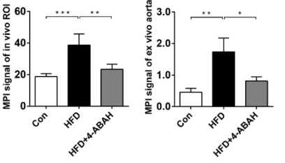 如图4所示,HFD组的MPI信号显着高于Con组(38.72±6.99 vs 18.77±1.97,P <0.001)和HFD + 4-ABAH组(38.72± 6.99 vs 25.07±3.72,P <0.005)。HFD组的主动脉离体MPI信号显着高于Con组(1.74±0.25 vs 0.46±0.07,P <0.005)和HFD + 4-ABAH组(1.74±0.25 vs 0.81±0.08,P<0.05)。